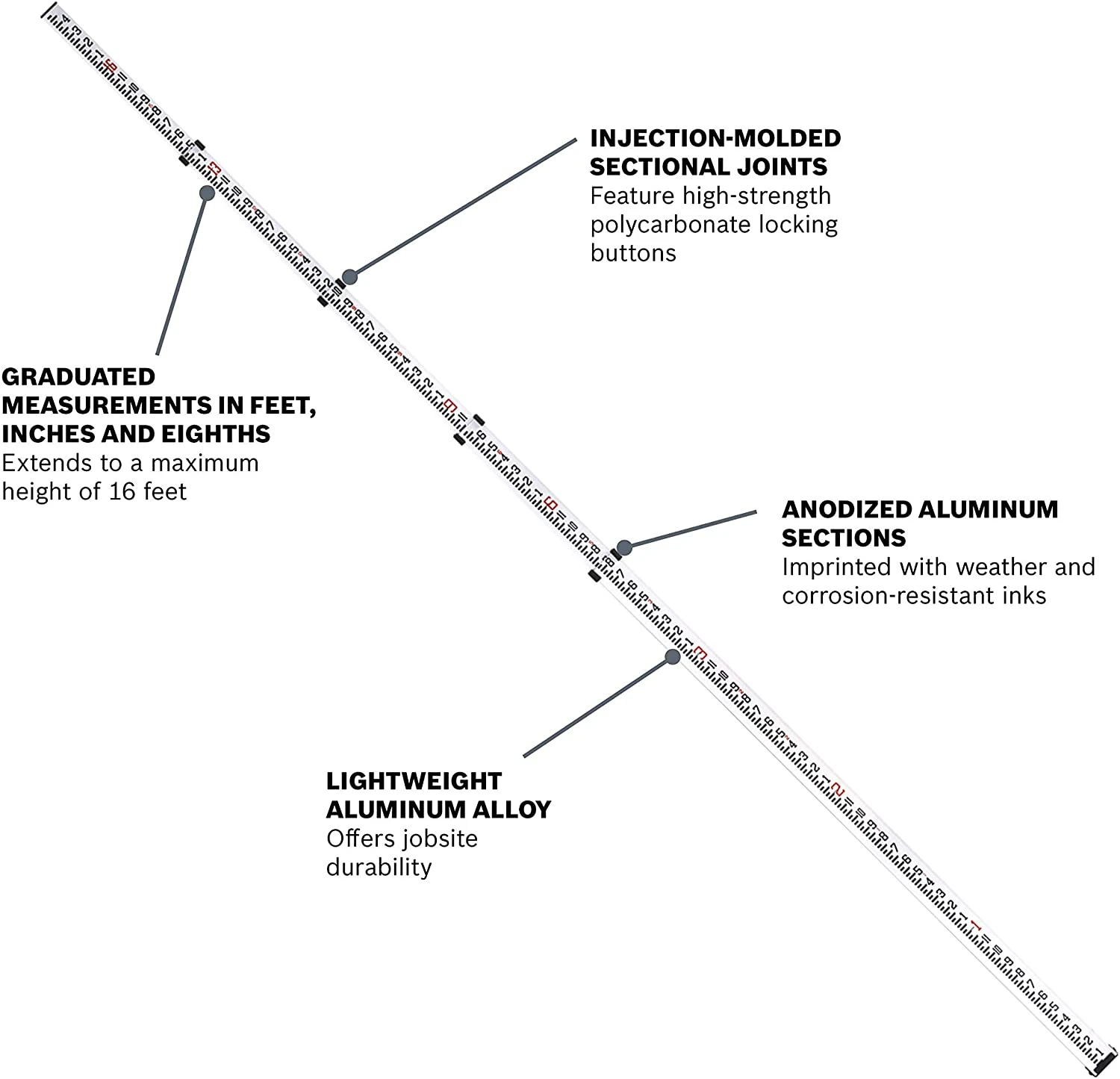 Bosch’s 16′ Telescoping Leveling Aluminum Rods are made of a light and durable aluminum alloy. The anodized sections are imprinted with special weather resistant and corrosion resistant inks. Tight tolerances on extruded aluminum sections allow for smooth extension and prevent unnecessary clattering and sloppiness. The sectional joints are injection molded from a durable lightweight impact-resistant plastic. Rods are equipped with reliable and wear-resistant polycarbonate buttons that lock each section. Easy-to-read graduations and a special measuring scale on the backside permit users to read height at eye level.