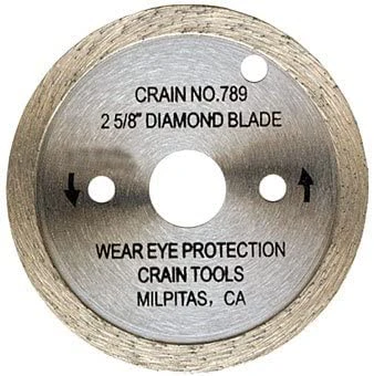 Accessory diamond blade for use on Crain Model No. 775, No. 777, No. 785 or No. 795 Toe-Kick Saws. It is a 2-5/8″ diameter continuous rim dry cutting diamond blade for cutting ceramic tile, brick, concrete, stone, or for removing grout. It cuts to a fixed depth of 3/8″ using the saw. For best results, cut 6 feet maximum, then allow cooling. Do not overheat. Check that chicken wire or expanded metal has not been installed beneath the material to be cut. Avoid cutting wood particularly wood subfloors as this gums up the blade and shortens life – shim up the saw as necessary. Not for use in cutting any metals.