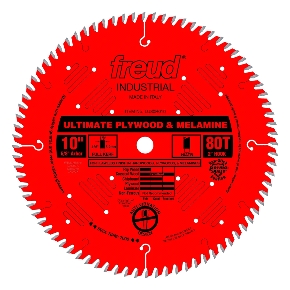 Use for crisp, splinter-free and chip-free cuts in hard and soft woods. Flawless finish in veneered plywood, melamines & laminates. Perma-Shield coating guarantees less working friction and less resin adhesion while preventing the development of rust.