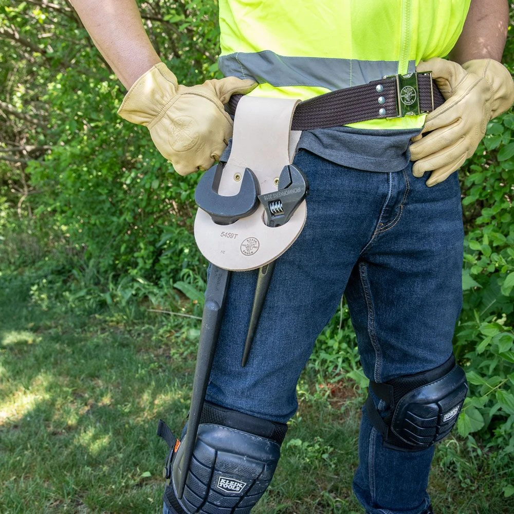 The Klein Tools Erection Wrench Holder Saves time on the job by keeping tools accessible. It features a convenient belt loop and 2 slots for holding up to 2 wrenches. The holder can also accommodate an adjustable-head construction wrench.