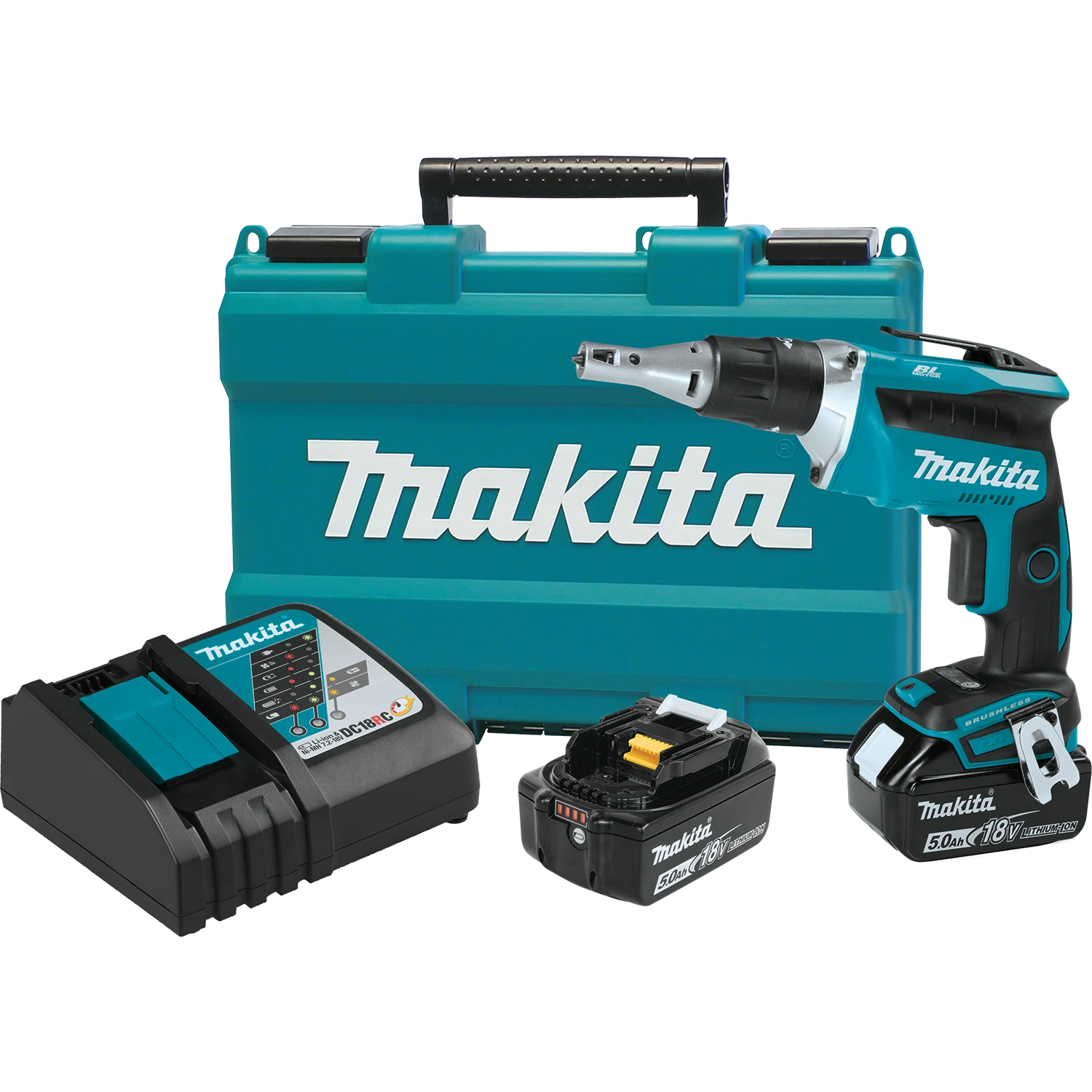 The 18V LXT Lithium-Ion Cordless Drywall Screwdriver Kit (model XSF03T) breaks new ground for drywall contractors. It is ideal for hanging sheetrock, metal framing, installing subfloors, backer board, and decking applications.It’s powered by a Makita BL Brushless Motor for longer run time, increased power and speed, and longer tool life. With the exclusive Push Drive Technology, the 18V Drywall Screwdriver can be set on lock-on mode so the motor starts only when the fastener is engaged. This gives contractors a quieter work environment, and also saves on battery power. It’s built for added durability with Extreme Protection Technology (XPT), which is engineered for improved dust and water resistance for operation in harsh job site conditions. The 18V LXT 5.0 Ah battery provides 65% more run time per charge than the 3.0Ah battery (BL1830), yet it charges in only 45 minutes – the fastest charge-time in the category ‚Äì for less downtime and increased productivity. For added convenience, the battery features an integrated L.E.D. battery charge level indicator.