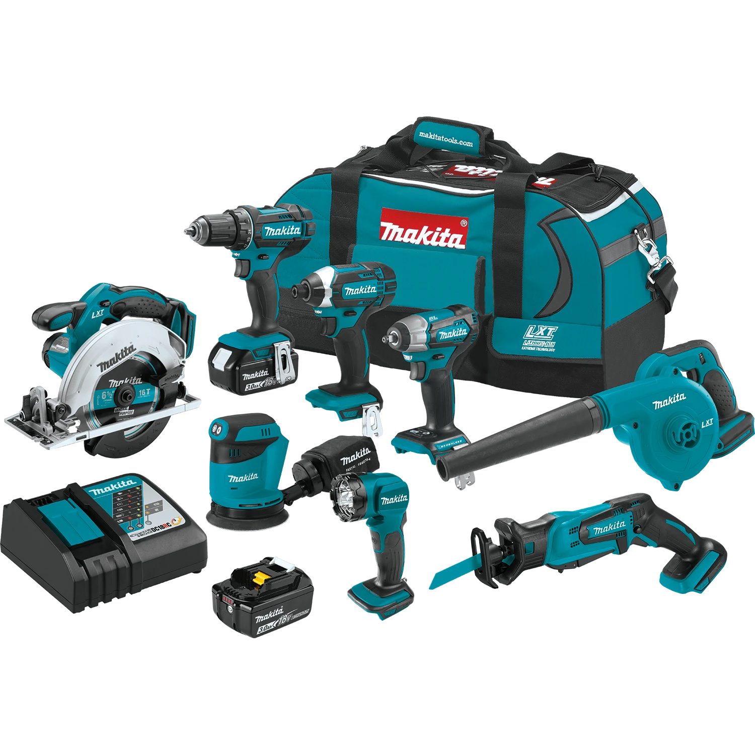 This combo kit includes 8 Makita 18V LXT Cordless Products, including XFD10Z, XDT11Z, XSS02Z, XRJ01Z, XOB01Z, XWT12ZB, DUB182Z, DML815 and 2 each 18V LXT batteries.